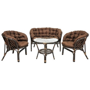 Это подушки, предназначенные для комплекта садовой мебели Багама, изготовлены они из непромокаемой ткани оксфорд, сам комплект однотонный и выполнен в коричневом цвете. В комплекте находятся подушки для дивана, а также двух кресел, спинка и сидения являются отдельными элементами. прикрепляются подушки к мебели при помощи завязок, в качестве наполнителя используется поролоновая крошка, подушки простёганы при помощи пуговиц. Используется ткань оксфорд, имеющая плотность 230 г., диаметр сидения кресла составляет 56 см, ширина спинки кресла 100 см, а высота 38 см. Ширина сидения дивана составляет 100 см, глубина 56 см, ширина спинки дивана 165 см, а высота 38. Весит данный комплект подушек 10 кг, а объём составляет 0,3 м³.